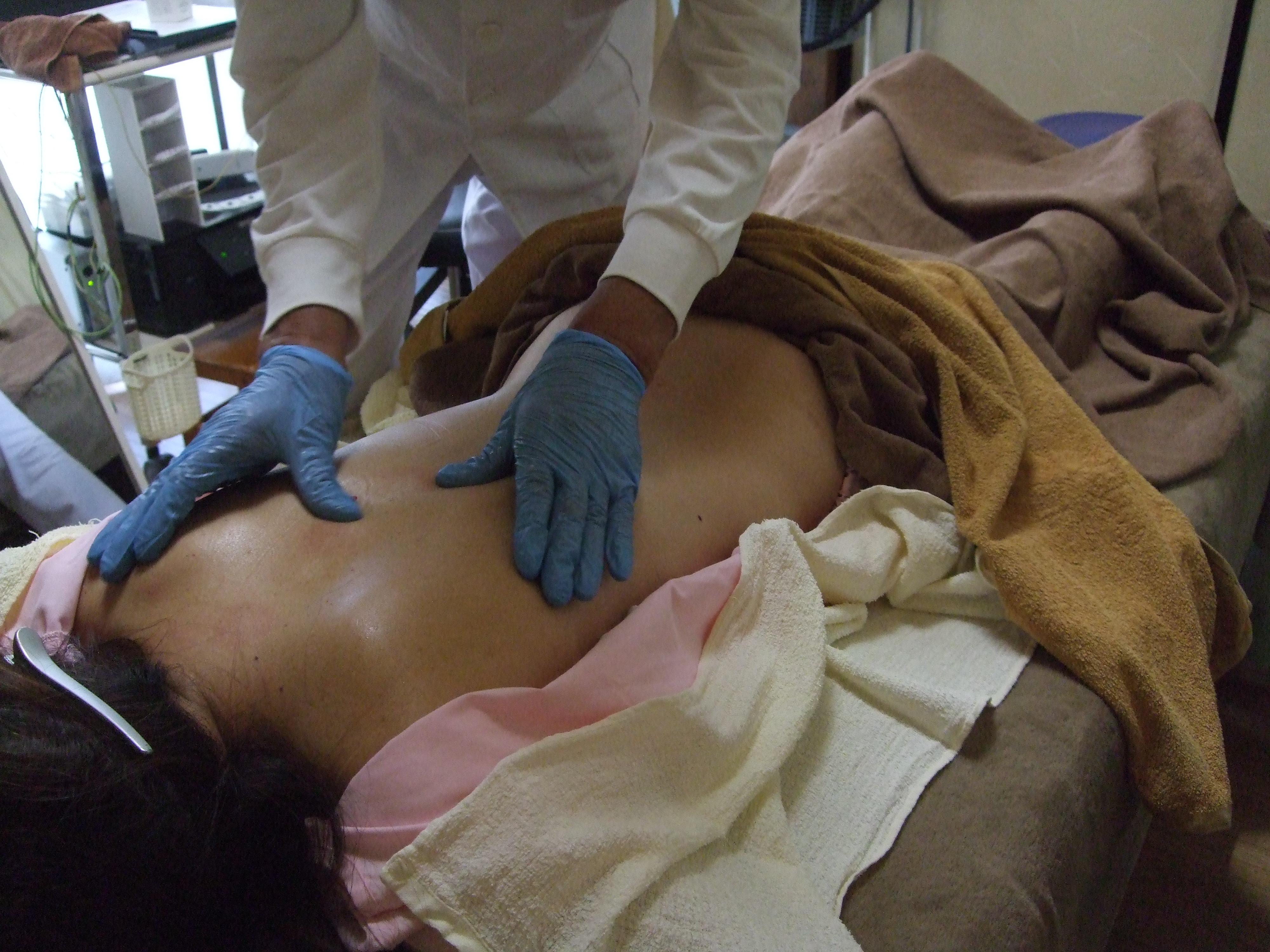 背部鍼灸施術(上) 背部オイルトリートメント(下)