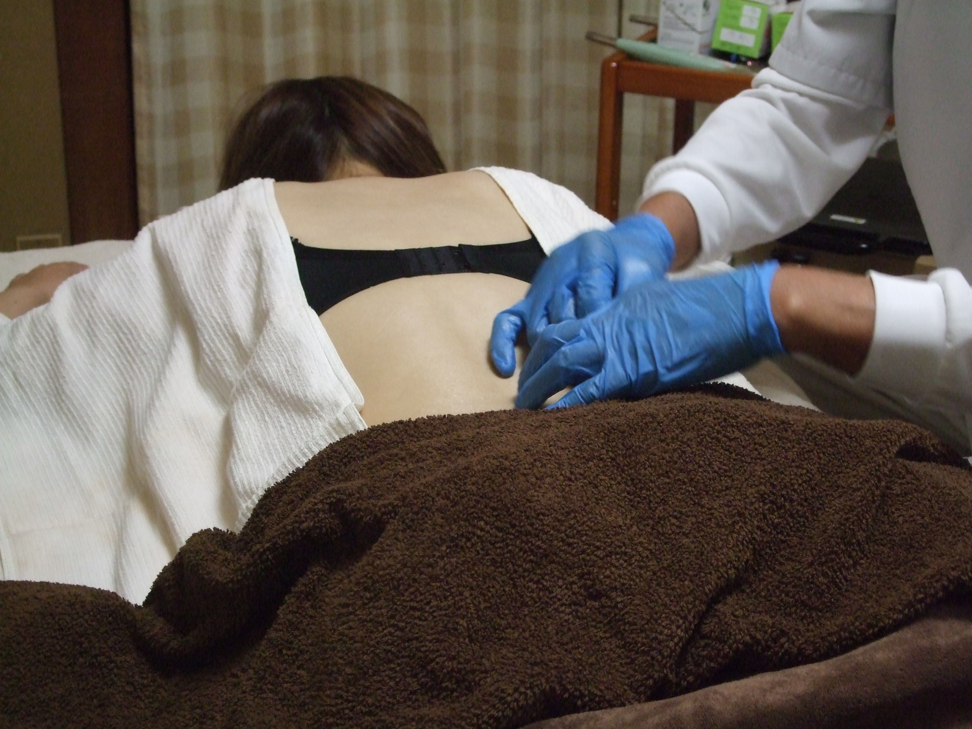 腹部接触鍼施術(上) 背部接触鍼施術(下)
